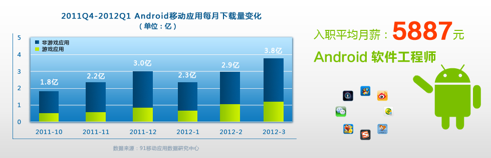 随着Android平台的扩张,引发了Android人才荒,2010年移动开发人才需求20万,未来人才需求缺口将达百万。3G人才全球紧缺,实用人才培养已迫在眉睫。