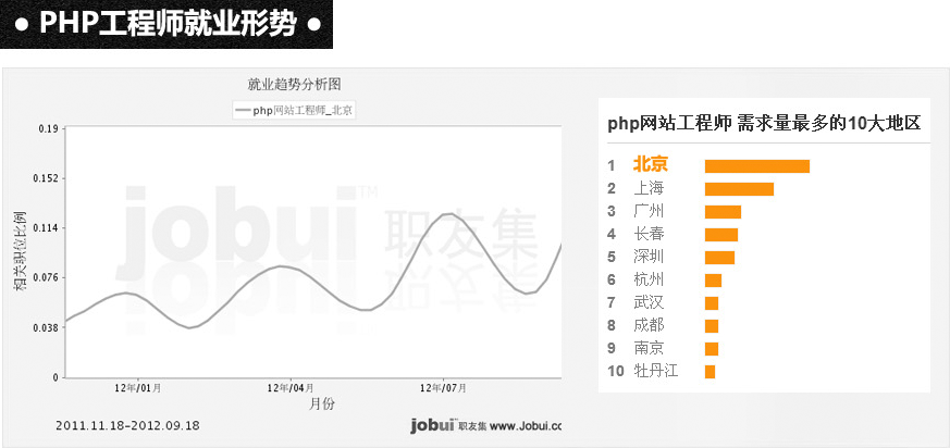 以北京为例,PHP工程师平均薪资为5069元;招聘待遇及招聘条件的分布,
